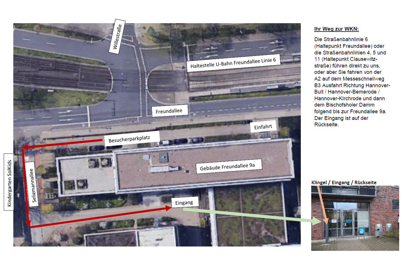 Die Straßenbahnlinie 6 (Haltepunkt Freundallee) oder die Straßenbahnlinien 4, 5 und 11 (Haltepunkt Clausewitz-straße) führen direkt zu uns, oder aber Sie fahren von der A2 auf dem Messeschnellweg B3 Ausfahrt Richtung Hannover-Bult / Hannover-Bemerode / Hannover-Kirchrode und dann dem Bischofsholer Damm folgend bis zur Freundallee 9a. Der Eingang ist auf der Rückseite des Gebäudes-Nr. 47.